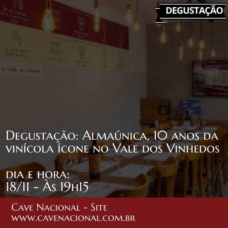Na sequência de eventos em comemoração aos 10 anos da Cave Nacional, Denise Brandelli, enóloga e proprietária da Vinícola Almaúnica contará online a história recente (2015 a 2025) da Vinícola Almaúnica, bem como apresentará alguns vinhos vinificados nesse período. Para guiar o tema, serão degustados 6 vinhos, incluindo algumas garrafas da reserva da Cave Nacional bem como o icônico Eterno Syrah 2017.